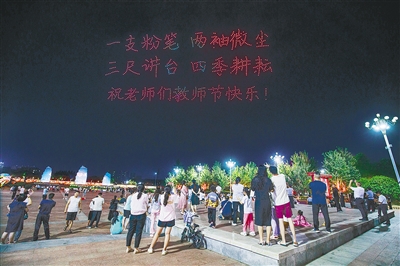 晚上8點至9點,紅楓廣場千機飛“只有漯河”無人機展演和全市地標(biāo)建筑、大中小學(xué)校LED顯示屏及出租車、公交車顯示屏等,以字幕滾動方式為教師亮燈。“大力弘揚教育家精神,加快建設(shè)教育強國”“老師,您好!”“教師節(jié)快樂!”“老師,您辛苦了!”等主題詞成為教師節(jié)夜晚一道亮麗的風(fēng)景線。