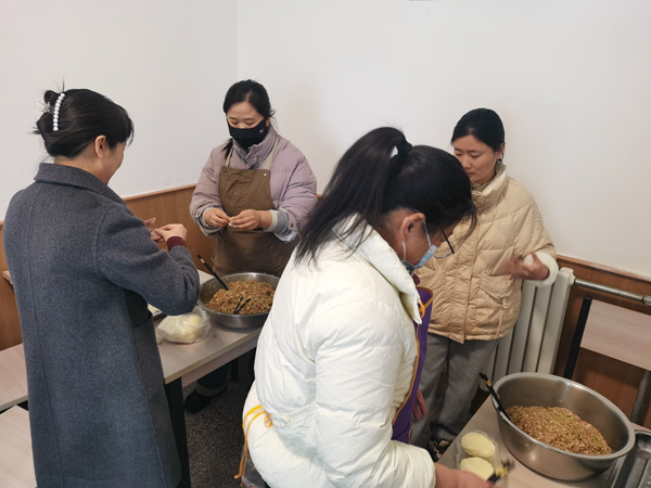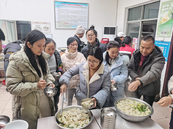 10點(diǎn)半,臺(tái)領(lǐng)導(dǎo)和職工代表來(lái)到職工餐廳組織包餃子活動(dòng)。臺(tái)工會(huì)提前準(zhǔn)備好了20多斤羊肉、豬肉餃子餡,大家分工協(xié)作,有人搟餃子皮,有人包餃子,有人燒水煮餃子,經(jīng)過(guò)一個(gè)多小時(shí)的準(zhǔn)備,一盆盆熱氣騰騰的餃子端上餐桌,大家在其樂(lè)融融的氛圍中,度過(guò)了一個(gè)意義非凡的冬至節(jié)。