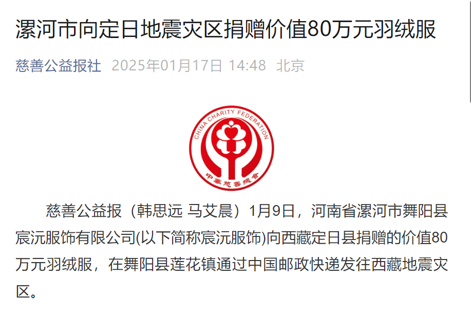 1月9日,河南宸沅服飾有限公司總經(jīng)理李書(shū)鋒聯(lián)系市縣慈善總會(huì),捐贈(zèng)價(jià)值80萬(wàn)元的羽絨服,通過(guò)中國(guó)郵政快遞專(zhuān)車(chē)發(fā)往西藏災(zāi)區(qū)。