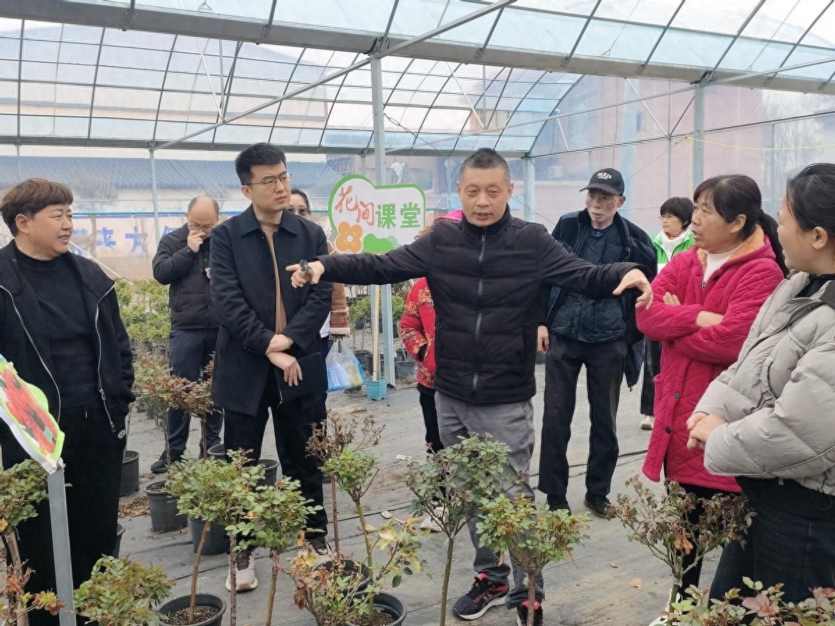 雙輪驅(qū)動破解產(chǎn)業(yè)困局。作為傳統(tǒng)月季專業(yè)村,潘牛村曾因品種單一陷入“花開時節(jié)卻愁銷”的困境。為此,趙基元依托園林專業(yè)優(yōu)勢,并聯(lián)合村“兩委”開展“把脈式”調(diào)研,梳理出成本、技術(shù)、市場三大癥結(jié)。在多方走訪,會商研判后,提出通過構(gòu)建“月季提質(zhì)+草花增量”雙軌戰(zhàn)略,在保持精品月季種植優(yōu)勢的同時,引入孔雀草、百日草等觀賞期長草花,形成“長短期互補、高低端搭配”的種植格局。同時,依靠園林技術(shù)團隊創(chuàng)新研發(fā)的草花種苗自育體系,使每畝用苗成本從1000元壓縮至600元,配合科學(xué)輪作模式,新品種培育試驗田可實現(xiàn)“四季有花出圃”。