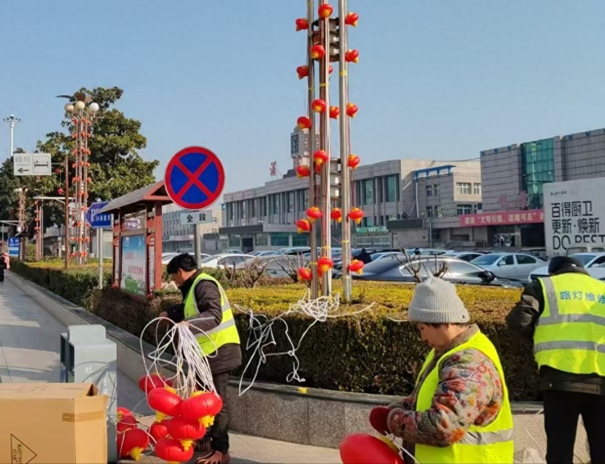 2025年1月20日下午,在河南省漯河市區(qū)火車(chē)站廣場(chǎng),工作人員正在路邊忙碌,他們認(rèn)真串接燈籠,有序懸掛裝飾,相互協(xié)作,高效推進(jìn)市區(qū)迎春燈飾安裝工作,全力扮靚城市名片。