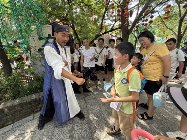 一踏入萬(wàn)歲山武俠城,古色古香的宋代街巷和建筑便映入孩子們眼簾,仿佛穿越回了千年前的大宋。街道上,鄭記肉鋪、獅子樓、王婆茶莊等實(shí)景店鋪,充滿(mǎn)生活氣息,孩子們好奇地打量著,想象著古人的生活場(chǎng)景。街邊藝人的精彩表演引得孩子們陣陣驚嘆,歡呼聲此起彼伏?!度蜃<仪f》里,逼真的城墻、城門(mén)、大炮和烽火臺(tái),激烈的戰(zhàn)斗場(chǎng)面配合影視爆破、云梯炮戰(zhàn)、大型馬術(shù)等實(shí)景拍攝技術(shù),將《水滸傳》中的情節(jié)鮮活呈現(xiàn),孩子們看得目不轉(zhuǎn)睛,被綠林好漢們的江湖豪情深深吸引,演出結(jié)束后,掌聲雷動(dòng)。在萬(wàn)歲山武俠城內(nèi),孩子們還觀賞了多場(chǎng)精彩絕倫的演出。從《吊環(huán)》的驚險(xiǎn)特技到《大宋奇兵》的英勇無(wú)畏,再到《李逵斷案》和《林沖戰(zhàn)楊志》……此外,孩子們還進(jìn)行了一系列互動(dòng)體驗(yàn)活動(dòng)。通過(guò)石頭剪刀布、投壺等游戲來(lái)賺取銀票,換取自己喜歡的物品。每一場(chǎng)演出都讓孩子們陶醉其中,流連忘返。