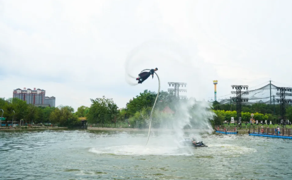 水上表演更是精彩絕倫?!丢?dú)竹水上漂》節(jié)目中,表演者們腳踩楠竹,在水面上輕盈滑行,仿佛在水上飛舞,引得觀眾們驚嘆不已?!端巷w人》的表演者們借助噴水裝置在空中翻轉(zhuǎn)騰挪,如同超人般翱翔于水面之上;而《水上火壺》則將傳統(tǒng)藝術(shù)與現(xiàn)代科技完美結(jié)合,火光與水花交相輝映,震撼的視覺效果讓觀眾們?nèi)滩蛔“l(fā)出陣陣喝彩和尖叫。鳳棲湖劇場內(nèi),大型舞臺劇《時(shí)空奇緣》的現(xiàn)場排練預(yù)演同樣精彩,演員們精湛的表演和動(dòng)人的故事引得觀眾掌聲雷動(dòng),沉浸其中。