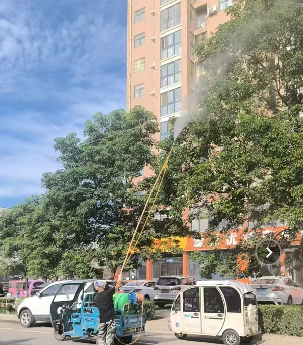 區(qū)園林職工運(yùn)用高射程噴霧車噴藥物防治白粉虱