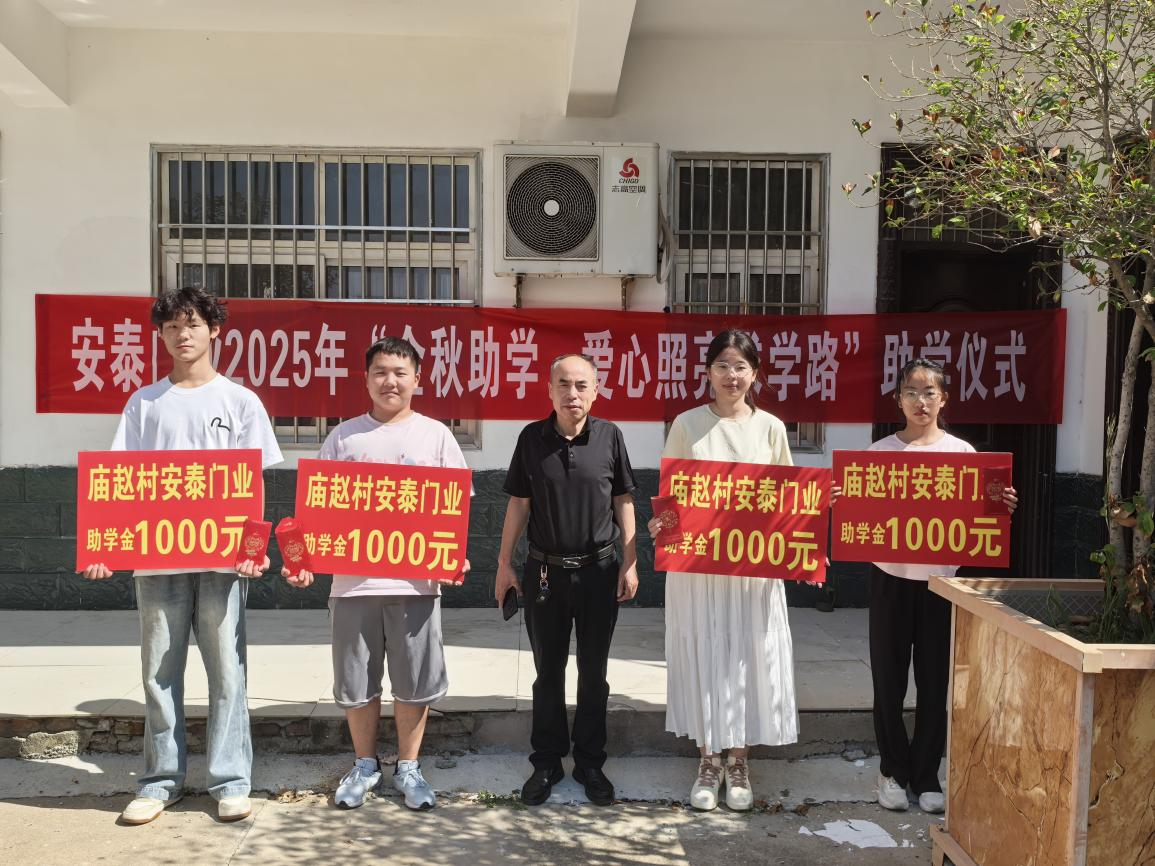2025年8月22日上午,龍城鎮(zhèn)廟趙村洋溢著溫暖與希望的氛圍,愛心企業(yè)安泰門業(yè)2025年“金秋助學(xué)·愛心照亮求學(xué)路”助學(xué)儀式在這里隆重舉行,為村內(nèi)4名即將踏入大學(xué)校門的優(yōu)秀學(xué)子送去每人1000元助學(xué)金,以實際行動履行企業(yè)社會責任,鼓勵村里的優(yōu)秀學(xué)子努力奮進,幫助他們更好地開啟大學(xué)生活。