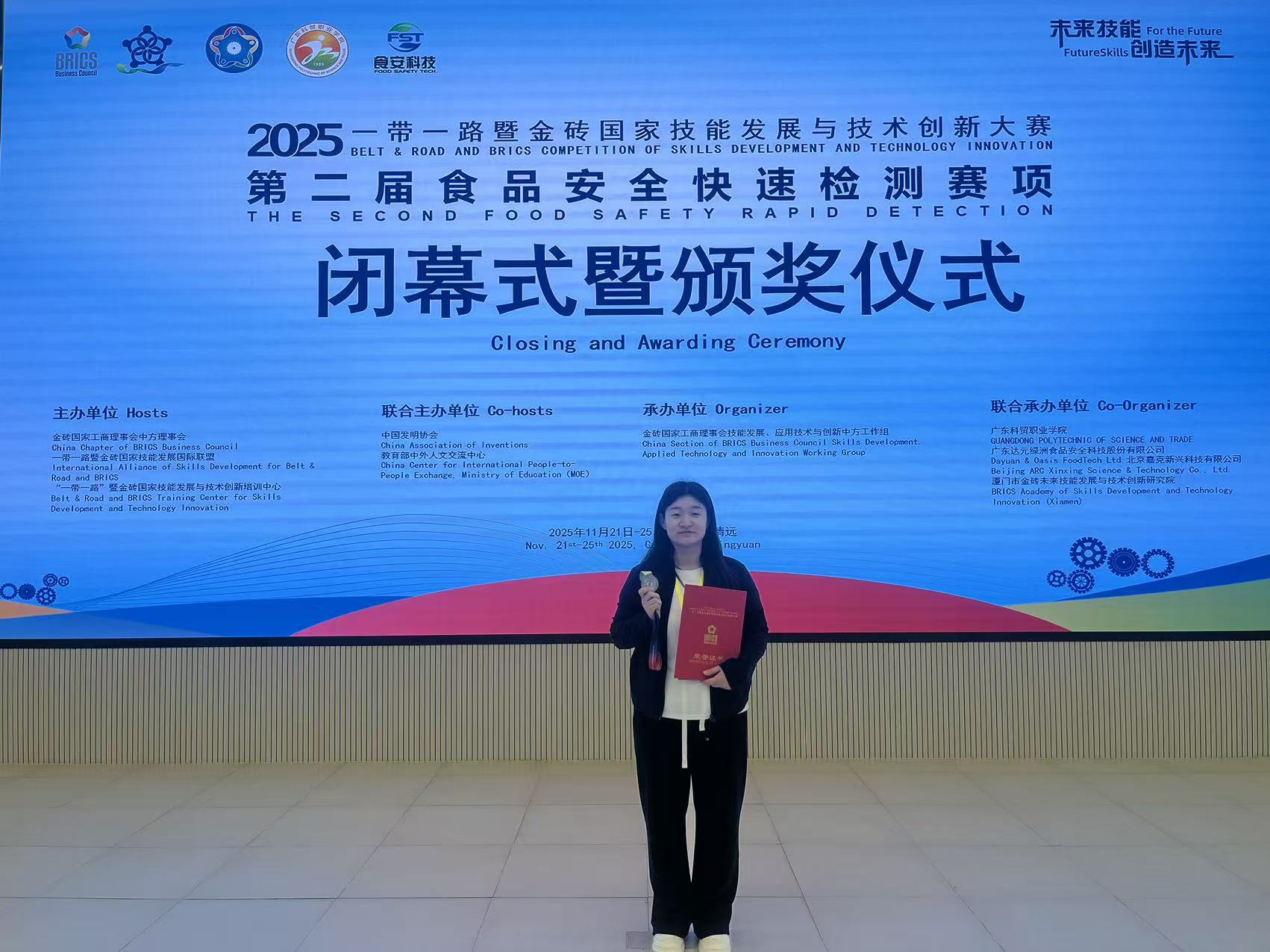 近日,2025“一帶一路”暨金磚國(guó)家技能發(fā)展與技術(shù)創(chuàng)新大賽“食品安全快速檢測(cè)賽項(xiàng)”全國(guó)總決賽在廣東科貿(mào)職業(yè)學(xué)院落下帷幕。漯河醫(yī)學(xué)高等專(zhuān)科學(xué)校(以下簡(jiǎn)稱(chēng)“漯河醫(yī)專(zhuān)”)公共衛(wèi)生與健康營(yíng)養(yǎng)學(xué)院教師陳沖憑借扎實(shí)的專(zhuān)業(yè)知識(shí)和精湛的實(shí)踐操作能力,在教師賽中脫穎而出,榮獲二等獎(jiǎng),充分展現(xiàn)了學(xué)校在食品安全快速檢測(cè)領(lǐng)域的教學(xué)實(shí)力與人才培養(yǎng)質(zhì)量。