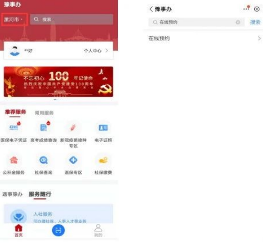 (2)左上角位置切換選擇漯河市,然后搜索“在線預約”。