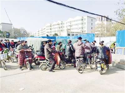 11月30日下午1點,記者來到解放路南段東貨場處的鐵路道口北側(cè),看到鐵道已經(jīng)被藍色圍擋圍了起來,在靠東側(cè)的位置留了一個寬約2米的出入口。在出入口處,擠擠攘攘地圍著20多輛電動車、三輪車、老年代步車等車輛,車主或坐在車上,或下車等待,耐心地等待著能夠通行。一些沒有耐心的車主,選擇調(diào)頭繞行,還有個別車主拿出手機打發(fā)時間。在鐵道口南側(cè),等待通行的行人、車輛則排起了長隊。