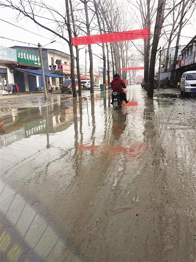1月8日中午,記者來到現(xiàn)場看到,路上還是一片積水,路兩邊濕漉漉的,路面上臟兮兮的。來往車輛從道路中間的積水里穿行,行人和騎車者都要小心翼翼地躲到路邊。