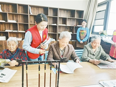 老人們在干河陳街道綜合養(yǎng)老服務中心讀書看報。