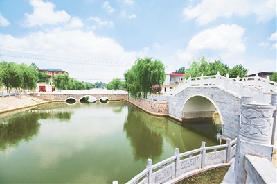 同時,對村內(nèi)300多畝荒坑、荒塘進行了綜合整治,通過開挖疏浚、石砌邊坡形成了完整的環(huán)村生態(tài)水系,又在水系上建設形態(tài)各異的橋梁9座,安裝青石欄桿3000多米,鋪設環(huán)水系步道6000多米,對兩岸進行高標準綠化、亮化,投放觀賞魚100萬尾。