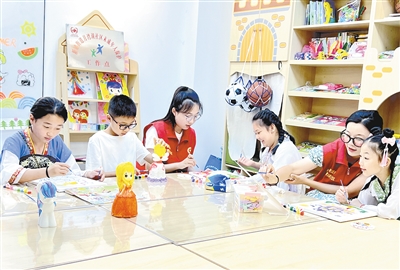 西城區(qū)月灣湖社區(qū)青少年活動(dòng)室里,志愿者在教孩子們做手工。記者 齊國(guó)霞 攝