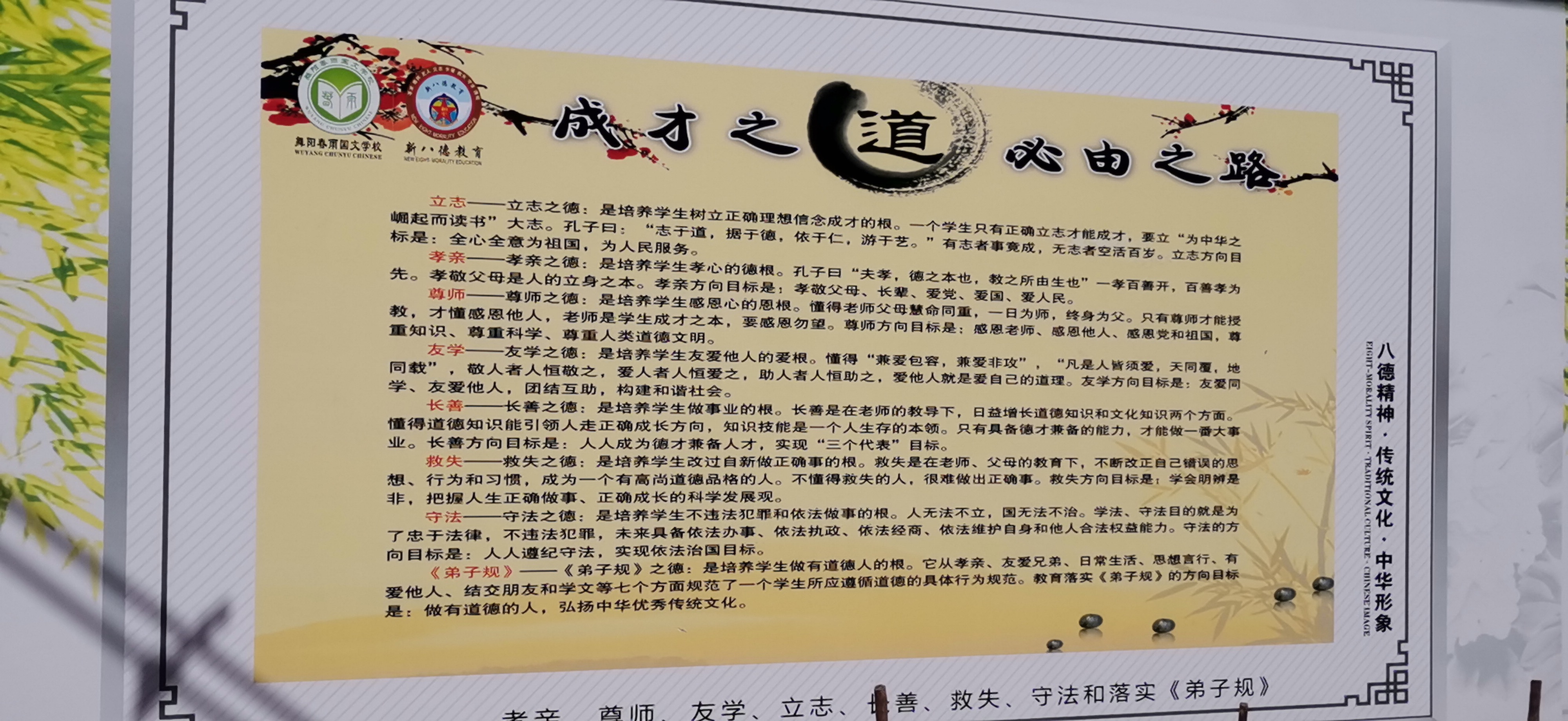 “孝親、尊師、友學、立志、長善、救失、守法和落實弟子規(guī)八個方面,是培養(yǎng)學生做人博愛、做事智慧、言行規(guī)范及拓寬心量的高效的立德樹人的教育!”朱喜洋校長對于新八德教育用于春雨國文學校,滿是自豪和驕傲。