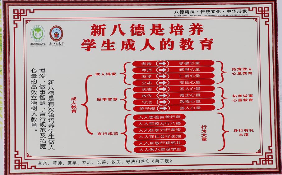 德育是學校教育的靈魂,是學生健康成長和學校工作的保障,德育的質(zhì)量是學校辦學水平的重要標志之一,把德育擺到優(yōu)先發(fā)展的位置,能讓學生受益一生,得益一世!為此,朱喜洋把“新八德”作為德育教育之基之核,他認為,抓住了“新八德”,就牽住了德育教育的牛鼻子。