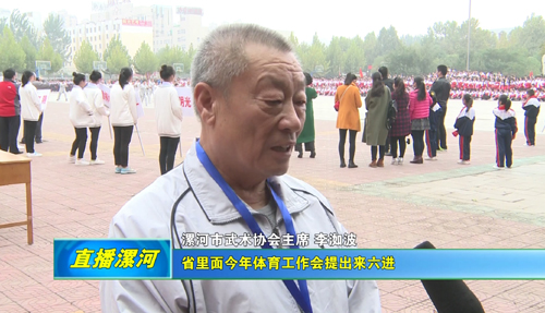 漯河市武術(shù)協(xié)會主席李洳波:國家對武術(shù)、包括體育這方面都非常重視,省里面今年提出來六進(jìn),武術(shù)進(jìn)校園放的比較靠前,所以咱漯河既然是國家級非物質(zhì)文化遺產(chǎn)項,所以說武術(shù)進(jìn)校園是咱必須要做到的一個,因為它不但要培養(yǎng)下一代,而且要把漯河的延續(xù)了幾百年的武術(shù)文化,咱要給它發(fā)揚光大。