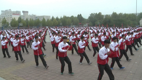 當(dāng)天上午9時許,展演開始,漯河四高的2000名學(xué)子身穿校服,伴隨著激昂的音樂,開始練習(xí)心意六合拳。他們動作整齊、出拳穩(wěn)重,腳步落地鏗鏘有力,場面令人震撼。他們用最嚴(yán)謹(jǐn)和精湛的武術(shù)技藝,演繹博大精深的中華武術(shù)文化,展示傳統(tǒng)武術(shù)的力量和魅力,為廣大武術(shù)愛好者奉上一場宏達(dá)的饕餮盛宴。