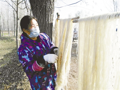 張夢(mèng)菊的兒媳婦正在整理晾曬的粉條。 記者 張曉甫 攝