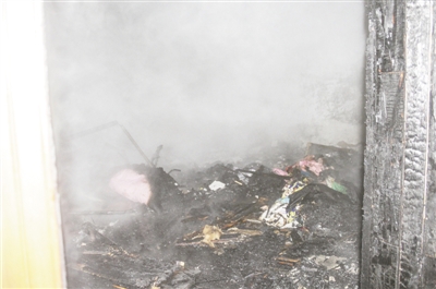 經(jīng)過40分鐘,大火最終被撲滅,但失火臥室內(nèi)的擺設已化為灰燼。房間內(nèi)一片狼藉,墻壁被熏得烏黑,臥室的門也被燒焦,大火已經(jīng)蔓延到了走廊,但由于撲救及時,才沒有釀成更大損失。