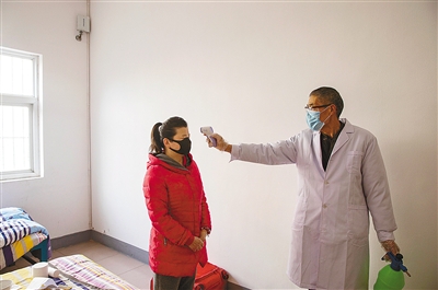 3月2日下午,在漯河市救助站二樓女區(qū),吃過午飯,余旺梅像往常一樣在房間內(nèi)休息,看手機(jī)上關(guān)于疫情進(jìn)展情況,然后測量體溫。余旺梅是一名月嫂,有時候,她還會看看書,或者練習(xí)一下按摩手法,為以后找工作做準(zhǔn)備。