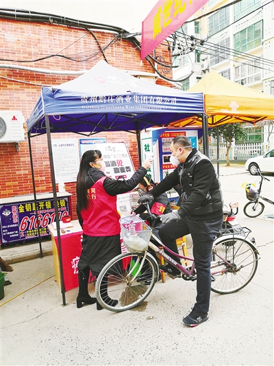 近日,郾城區(qū)沙北街道泰山社區(qū)發(fā)布防疫志愿者招募令,短時間內(nèi),有45名志愿者積極報名。據(jù)社區(qū)負(fù)責(zé)人趙保偉介紹,泰山社區(qū)共有28個無主管小區(qū),2個專業(yè)小區(qū),常住居民1.43萬人,共設(shè)立7個卡點。圖為志愿者為社區(qū)居民測量體溫。記者 吳艷敏 攝