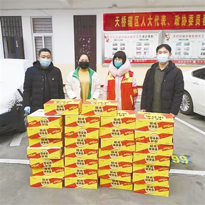 2月6日,志愿者楊英偉(左二)自費購買100箱方便面,分別送給召陵區(qū)東城街道辦事處、天橋街道辦事處和召陵區(qū)政協(xié)防疫值班點。記者 朱 紅 攝
