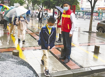“路上小心,不要扎堆,注意間隔一米以上……”5月7日下午,天下著蒙蒙細雨,在源匯區(qū)受降路小學(xué)門口,身穿紅馬甲的馮濤不時提醒排隊放學(xué)的學(xué)生注意間隔距離。一些學(xué)生路過時,主動向馮濤問好、鞠躬。
