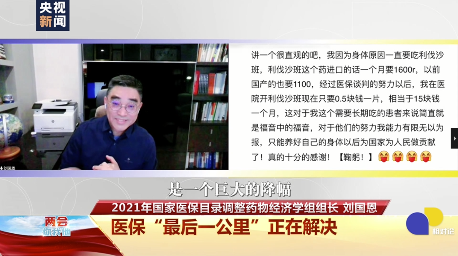 劉國恩:看到這些評論,肯定是非常欣慰的,非常非常欣慰。國家醫(yī)保局成立以來,在醫(yī)保目錄準(zhǔn)入談判、藥品集中帶量采購等方面做了很多工作,確實(shí)大大減輕了患者的經(jīng)濟(jì)負(fù)擔(dān)。與此同時(shí),從長遠(yuǎn)來看的話,國家支付能力、個(gè)人支付能力,不斷提高才是根本。說一千道一萬,最根本還是如何把我們中國的經(jīng)濟(jì),更好地、持續(xù)地、穩(wěn)定地,推向越來越好的增長水平。