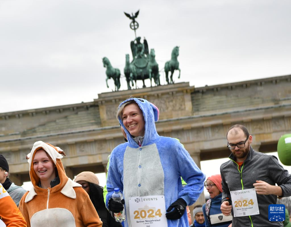 2024年1月1日,人們?cè)诘聡?guó)柏林勃蘭登堡門(mén)附近參加新年跑活動(dòng)。