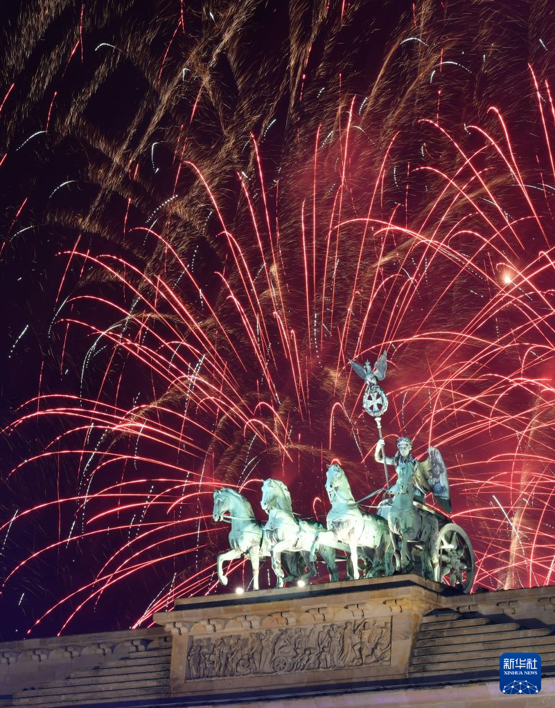 2023年12月31日晚,新年焰火在德國(guó)柏林的勃蘭登堡門(mén)上空綻放。