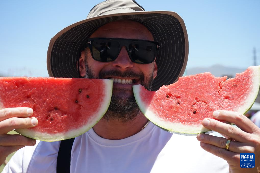 6月22日,一名男子在美國(guó)加利福尼亞州洛杉磯舉行的加州西瓜節(jié)上留影。