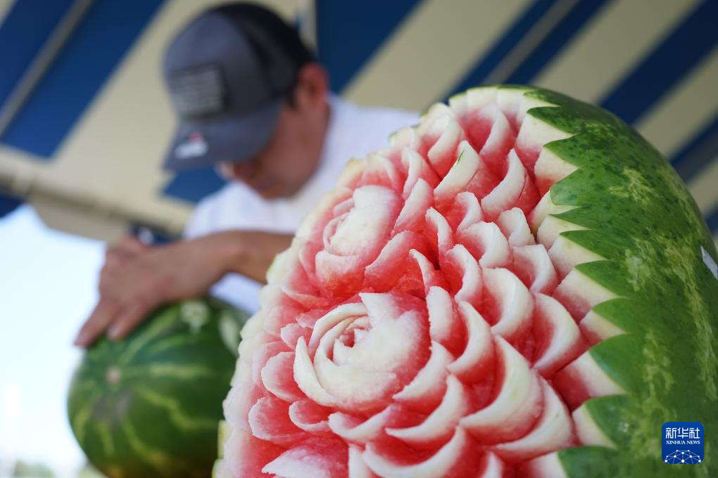 6月22日,一名男子在美國(guó)加利福尼亞州洛杉磯舉行的加州西瓜節(jié)上雕刻西瓜。