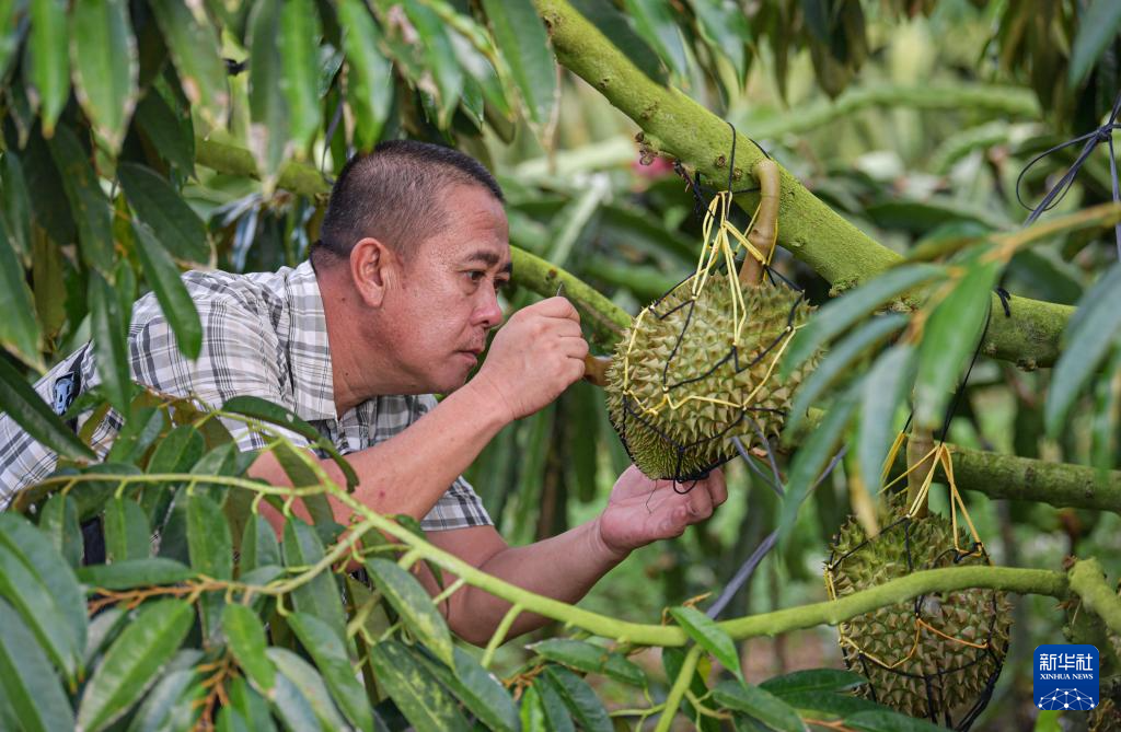 7月20日,工作人員在海南省三亞市傳福農(nóng)業(yè)南喵果園榴蓮基地查看榴蓮成熟度。