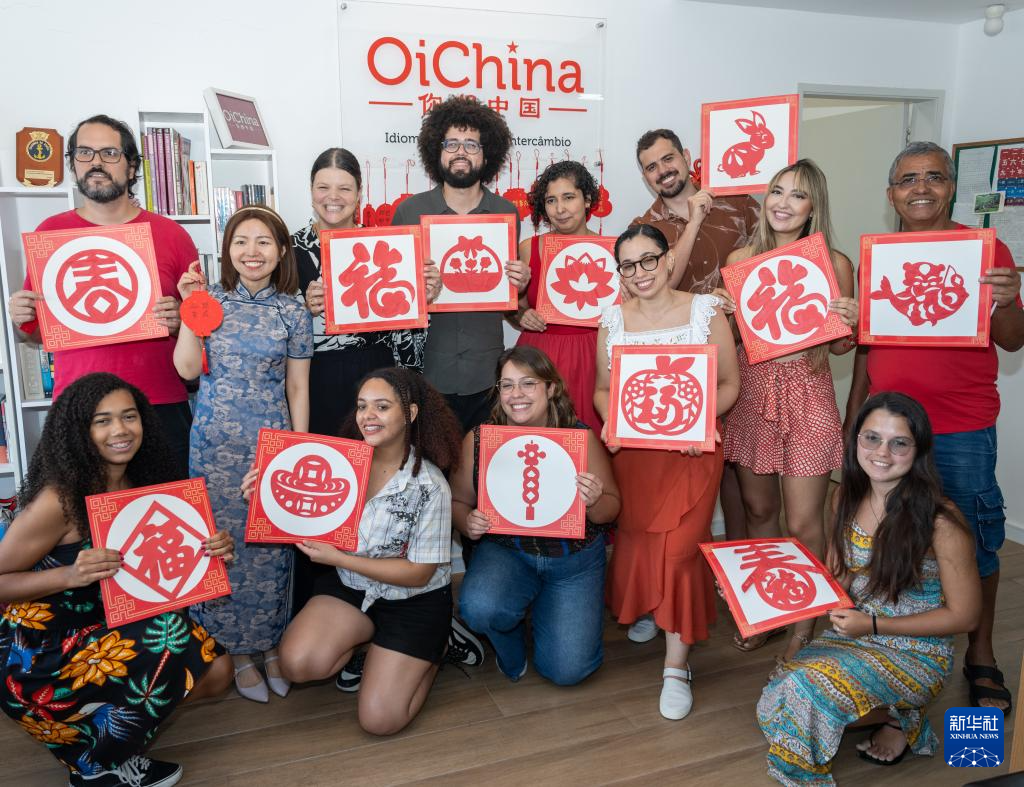 1月18日,人們在巴西里約熱內(nèi)盧舉行的中國春節(jié)文化體驗(yàn)活動上展示他們一起制作的剪紙。
