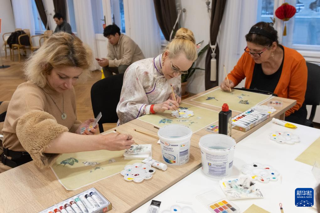 1月17日,在匈牙利布達(dá)佩斯,人們在“指尖上的非遺——中國文化體驗(yàn)日”為主題的2025“歡樂春節(jié)”活動上體驗(yàn)中國繪畫。