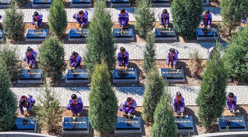 4月2日,河北省遵化市地北頭鎮(zhèn)學(xué)生在魯家峪烈士陵園向無(wú)名烈士獻(xiàn)花(無(wú)人機(jī)照片)。