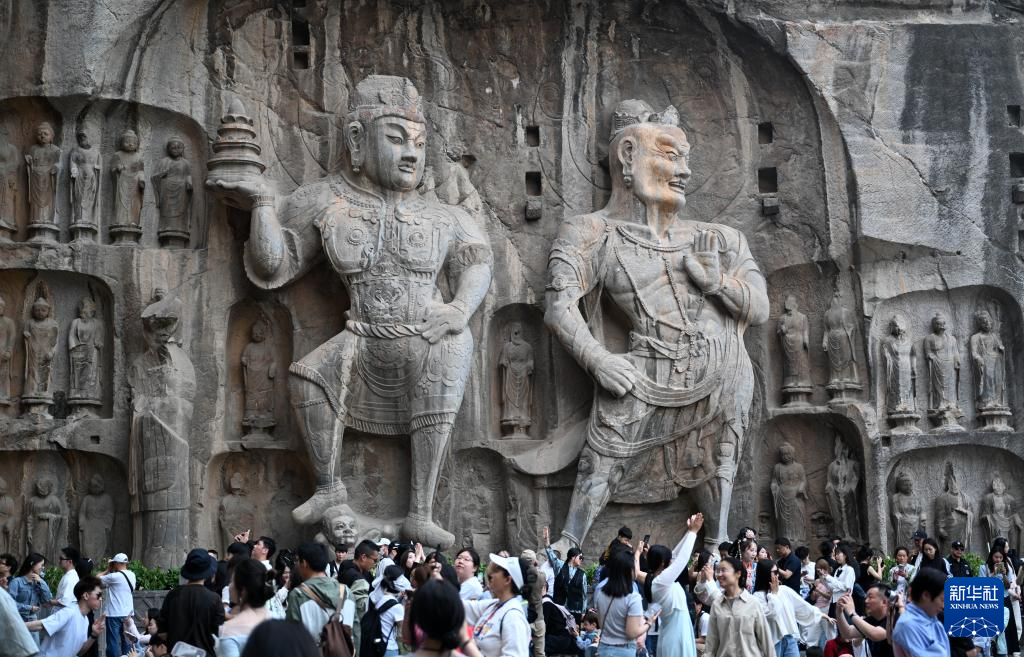 5月20日,游客在龍門石窟游玩(無人機照片)。