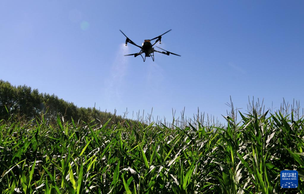 8月7日,在北大荒集團黑龍江格球山農(nóng)場有限公司第二管理區(qū),一架植保無人機為玉米噴施“營養(yǎng)液”。