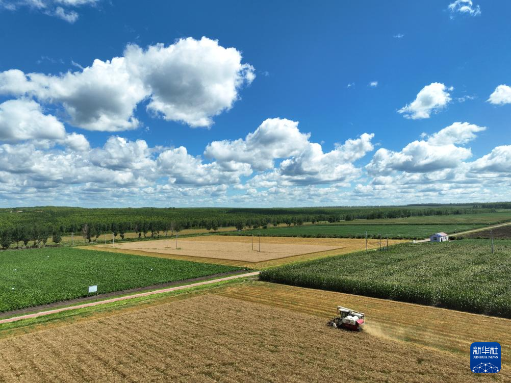 8月7日,在黑龍江省農(nóng)墾科學院九三科創(chuàng)中心,一臺收割機在小麥繁殖田進行收獲作業(yè)(無人機照片)。
