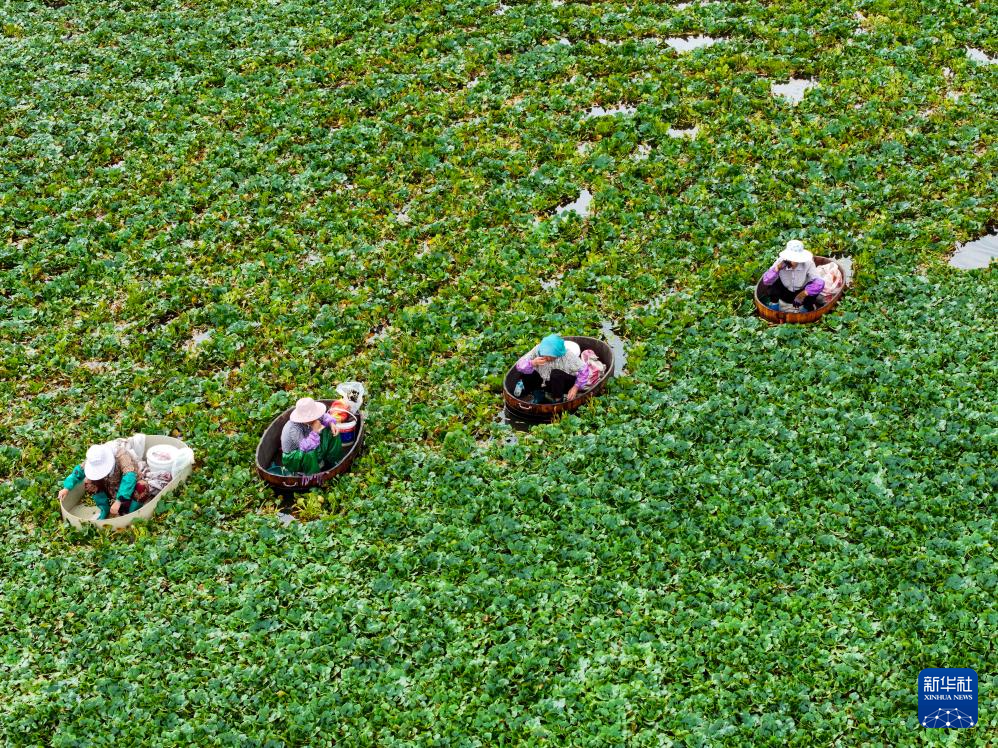 8月7日,江蘇省泰州市海陵區(qū)蘇陳鎮(zhèn)張家院社區(qū)農(nóng)民在菱塘采摘菱角(無人機照片)。