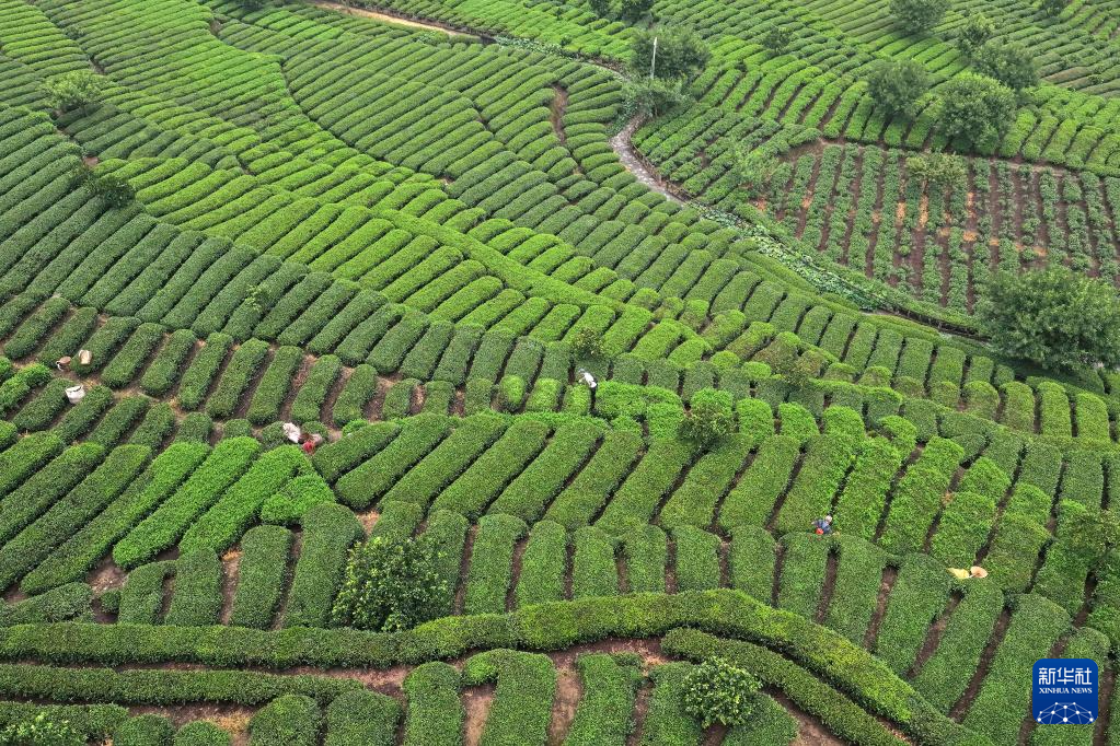 8月7日,茶農(nóng)在三峽庫區(qū)湖北省宜昌市秭歸縣茅坪鎮(zhèn)松樹坳村一茶園采摘秋茶(無人機照片)。