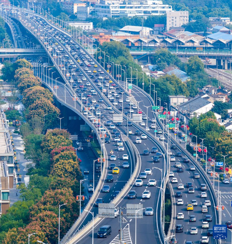 10月7日,車輛行駛在江蘇省南京市應(yīng)天高架上(無人機(jī)照片)。